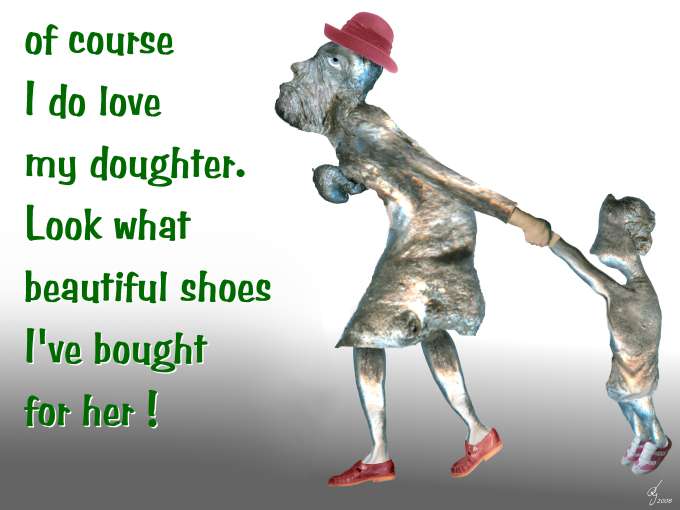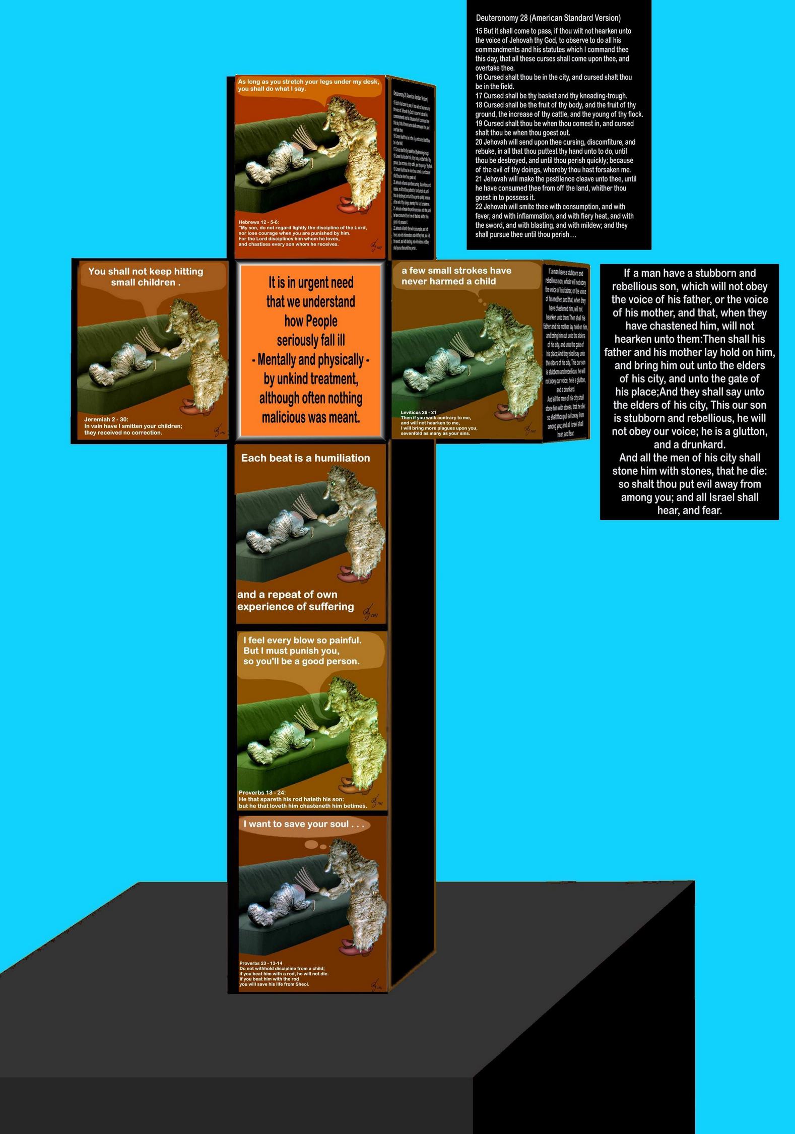 Collages with photos of pewter figures, such as from lead casting. Cartoons of children and adults, being unkind to their children. And caricatures of adults who as children also were treated carelessly and thus have lost their innate capacity for compassion and cooperation more or less. In front of the pavilion of the Critical Art Ensemble was a nearly man-high cross, which is plastered with images of a spanking scene, where the striking woman is shouting well known sayings, because these proverbs were not viewed as malicious in a time when corporal punishment in general was recognized as an educational tool, and was propagated in the Bible in several times, some of which proverbs are cited in the pictures. Picture of the Cross (for reading zoom in) . |