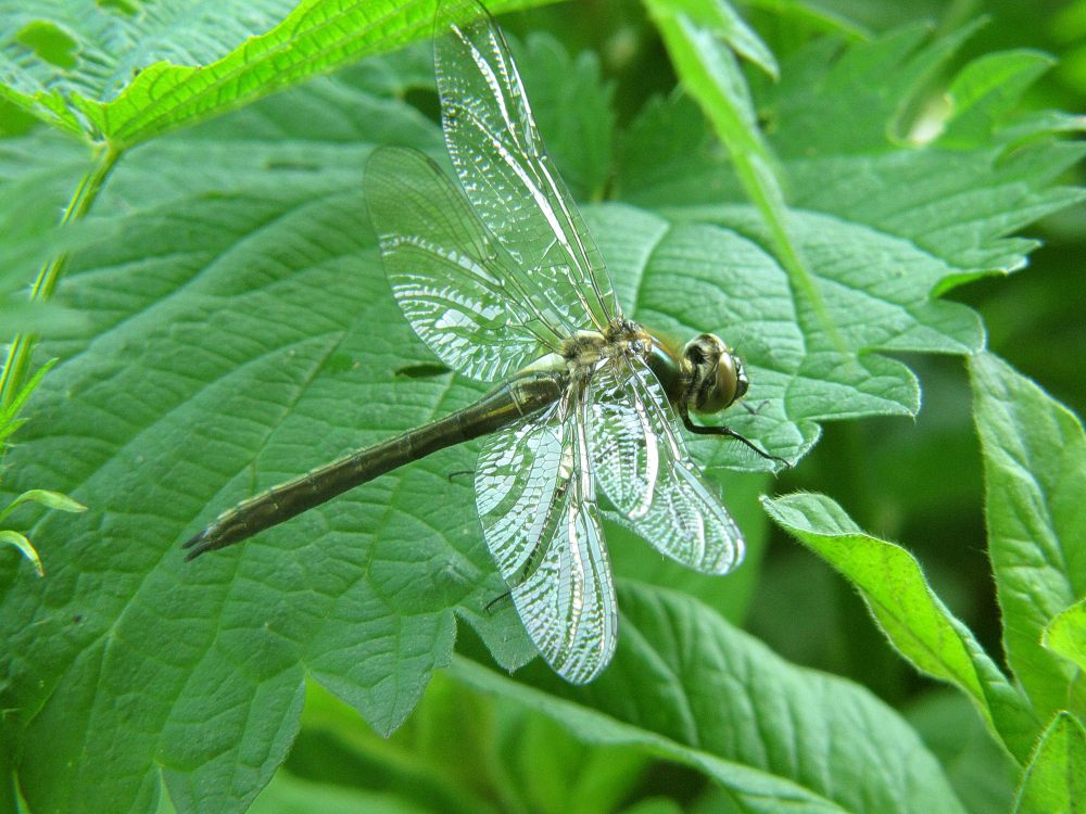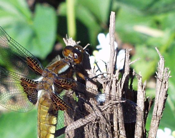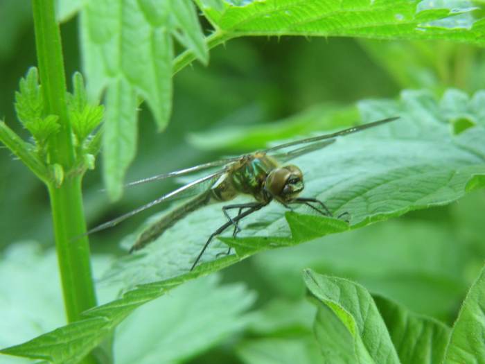 Foto des Plattbauchs ganz unten eingestellt. Man sieht, dass bei der Smaragd-Libelle die Augen trüber sind.
