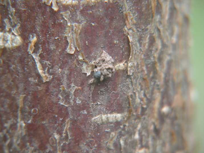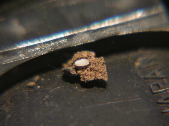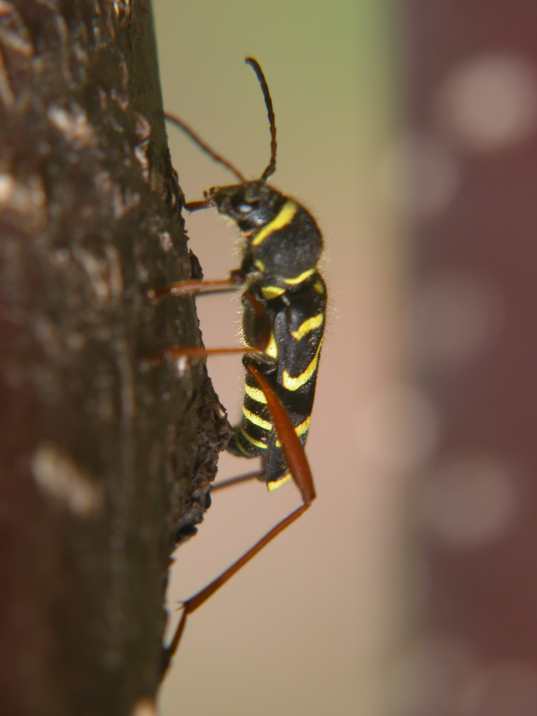 Diesen Wespenbock oder Echten Widderbock habe ich beobachtet und fotografiert, wie er an einer Haselnuss-Stange, die ich für meine Stangenbohnen verwende, Eier abgelegt hat. Mir fiel zuerst auf, dass er seinen Hinterleib nach unten drückte an einer rauhen Stelle. Ich holte schnell meine Kamera, und er war wirklich noch an der Stelle beschäftigt. Als er dann weiter ging, untersuchte ich die Stelle. Zuerst hielt ich das dunkle Korn für das Ei. Als ich aber eine Lupe zur Hilfe nahm, sah ich, dass das ein dunkles Sandkorn war und die rauhe Stelle ein Spritzer Erde, der an dem Stab festgetrocknet war. Als ich mit dem Fingernagel daran schob, löste sich dieses Stückchen Erde. Ich hatte meinen Kameradeckel darunter gehalten, wo es hinein fiel. Jetzt konnte ich sehen, dass der Käfer aber tatsächlich ein Ei abgelegt hatte in einen Hohlraum unter dem Erdspritzer. |