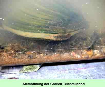 | Nun haben alle eifrig gekäschert. Jeder holte seine Wasserprobe, die dann genau untersucht wurde. Die große Teichmuschel (Gütefaktor 2), von der es viele in dem Weiher gibt, wurde in ein größeres Aquarium gegeben, wo man gut beobachten konnte, wie die Muschel atmet und das trübe Wasser sich dadurch allmählich klärte. |