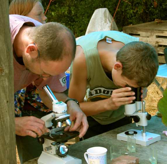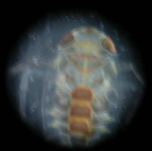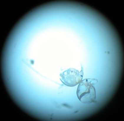 Noch größer und mit mehr Details sieht man sie unter einem Binokular oder Mikroskop. Ich hatte solche Geräte auch mitgebracht und sie wurden viel benutzt. Die Lebewesen so genau zu sehen, war offensichtlich für alle besonders interessant. Leider hatte ich keinen Kameraaufsatz für das Mikroskop, so dass die Aufnahmen nicht so gut wurden. Die zwei Wasserflöhe unten waren schon vorher tot, sie waren nicht mit den Köpfen verwachsen, wie es auf dem Foto scheint. |