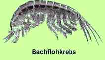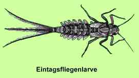 | Es gab auch neben den Teichmuscheln einige Tiere mit besserem Gütefaktor wie die Eintagsfliegenlarven mit dem Gütefaktor 2. Weil aber die weitaus häufigsten Tiere die Wasserflöhe waren, ergab die biologische Wassergütebestimmung eine Zuordnung zu Gütefaktor 3. (Gütefaktor 1 = Quellwasser, 4 = Jauche) | ![]() |