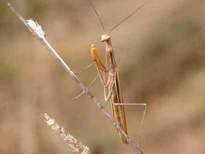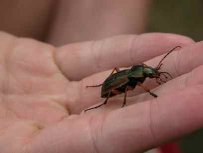 Weil ich nebenbei bei jedem Schmetterling, der herumflog, aufstand um ihn zu fotografieren, war die Aufmerksamkeit aller Kinder, aber auch der Erwachsenen für kleine Tiere wohl besonders groß. Und weil da jetzt jemand war, der sich in diesen Dingen einigermaßen auskennt, wurde mir so manches Tier gebracht, was sonst wohl weniger beachtet worden wäre - wie der Hainlaufkäfer und die Raupe vom Brombeerspinner (oben) oder die Gottesanbeterin (unten links).