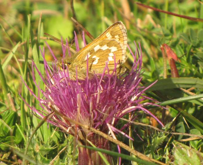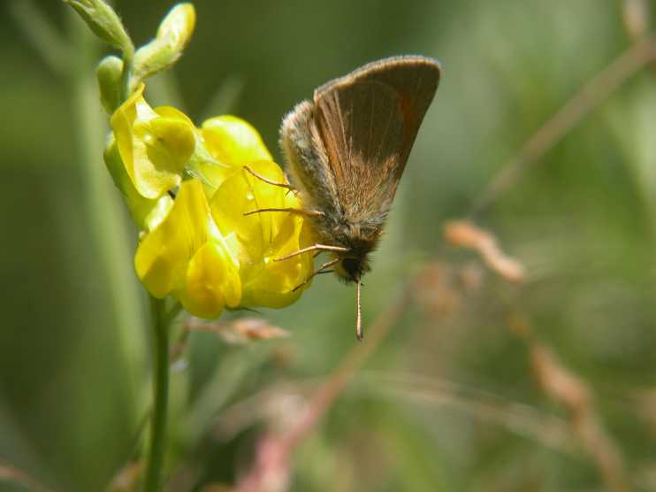 Schwarzkolbiger Braundickkopffalter - Thymelicus lineola, an Wiesen-Platterbse (oben der Fühler)