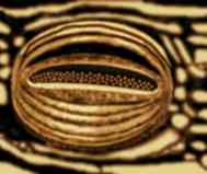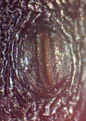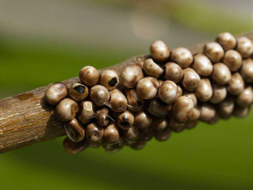 der Puppenhülle nach dem Schlupf der Falters, die Atemöffnungen sind