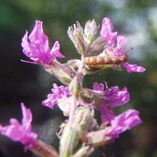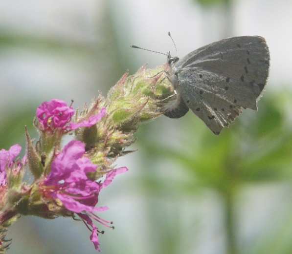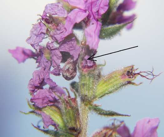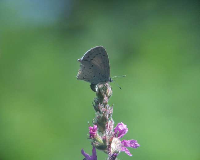Am 2. August 2002 konnte ich bei mir im Garten beobachten und fotografieren, wie ein Faulbaum-Bläuling seine Eier ablegte an den Blüten vom Blutweiderich.