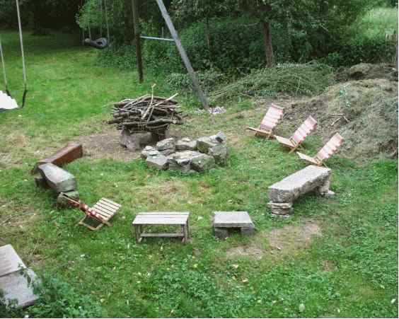 Die Feuerstelle ist vorbereitet für eine Feier.