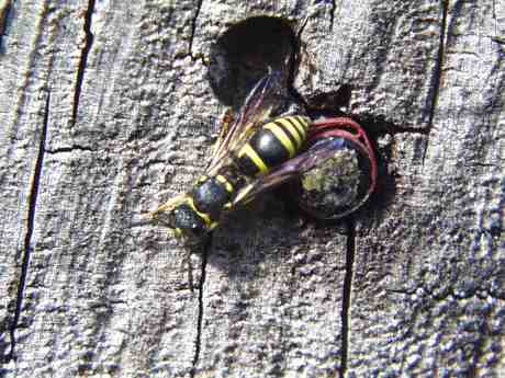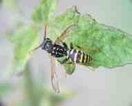 ![]() Faltenwespe Diese Faltenwespe der Gattung Symmorphus benutzt auch die angebotenen Brutröhren. Für ihre Larven trägt sie als Futter vorwiegend Käferlarven ein. |