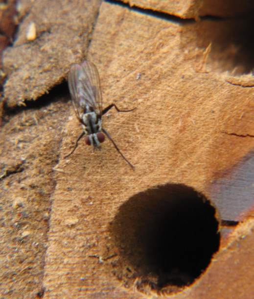 ![]() Diese kleine Fliege inspizierte recht zielstrebig die verschiedenen Niströhren dieser Nisthilfe für Mauerbienen. Ich bin sicher, dass sie ihre Eier dort abgelegt hat. Ob ihre Larven den eingetragenen Pollen fressen, ist mir nicht bekannt. |