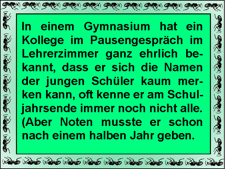 Wenn dann Lehrer noch an verschiedenen Schulen arbeiten müssen (Abordnung), bleiben ihnen nicht einmal Pausen oder Springstunden für solche Kontakte.