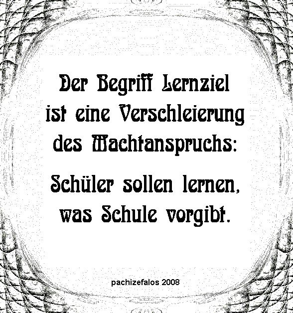 Irgend jemand hat geschrieben, (Martin Goldstein im Vorwort zu "Gras unter meinen Füßen" von Bruno-Paul de Roeck) das Wort Lernziel sei überhaupt unsinnig, weil Lernen kein zielgerichteter Vorgang sei. Das widerspricht zwar dem Sprachgebrauch, der auch Einpauken als Lernen bezeichnet, ("Ich muss noch für die Prüfung lernen!"), ist aber bestimmt nicht ganz von der Hand zu weisen.