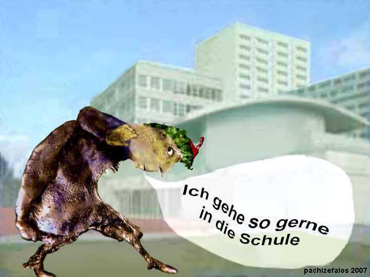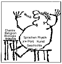 So naiv, wie Wilhelm Busch in "Maler Klecksel" die Nahrungsaufnahme darstellt, wird auch heute noch in Schulen den Schülern viel Inhalt eingetrichtert, ohne die Bedingungen zu beachten, unter denen Menschen wirklich lernen. Viel zu viel wird davon leider unverdaut wieder ausgeschieden (oder oft - nicht immer nur aus Sicht der jungen Menschen - Gott sei dank!). | ![]() |