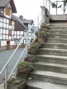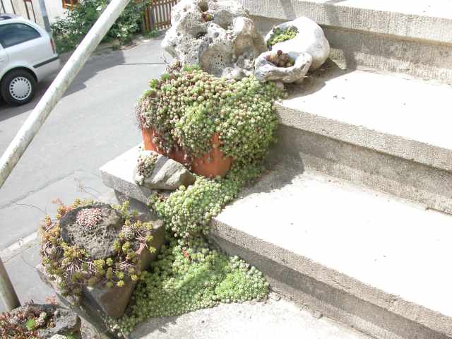 Zu diesem Stein (Bild 3) hatte ich auf der vorigen Seite etwas geschrieben. In der Zwischenzeit ist es geschehen, dass irgend jemand den Stein angehoben hat und so wieder hingelegt, dass Luft darunter kam und die Wurzeln eingetrocknet sind. Die ursprünglich in das Loch dieses Steines gepflanzte Hauswurz-Hybride ist in Folge dessen gestorben. Auf den Resten dieser Pflanze hat sich eine Spinnen-Hauswurz angesiedelt, die sich bei mir auf der Treppe besonders gut vermehrt, wie man auch an der Tonschale darüber erkennen kann, wo abgefallene Ableger sich auf der Treppe zu richtigen Polstern entwickelt haben. . |