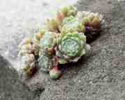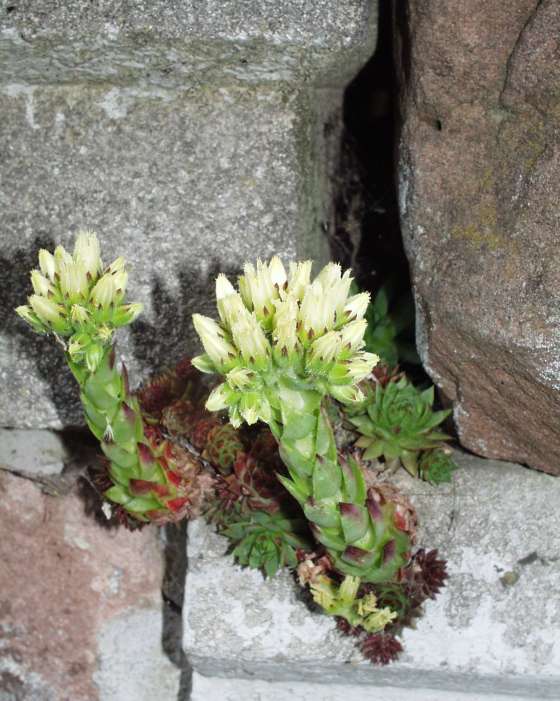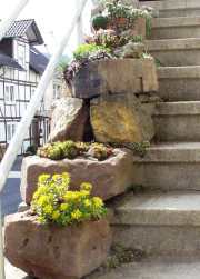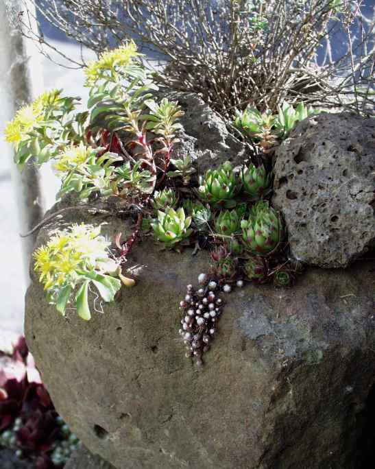 diese Hauswurz-Hybride wächst nur scheinbar auf der Fläche dieses Sandsteins, Tatsächlich ist im Stein ein gebohrtes Loch, durch das die Wurzeln hindurch bis unter den Stein gehen.