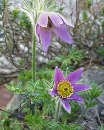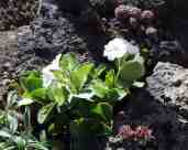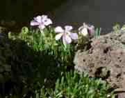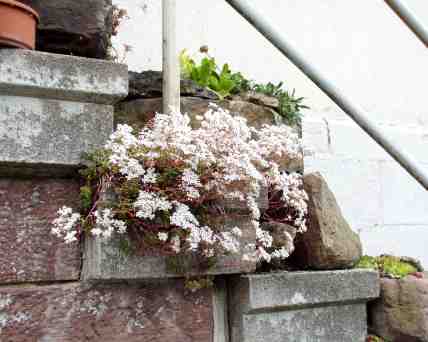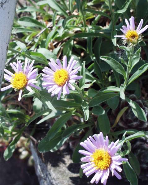 Aliionis Hauswurz, Jovibabarba alionii, ist wohl der größte Überlebenskünstler von den Pflanzen auf meiner Treppe. Ich hatte einige Rosetten von der Treppe abgemacht, weil sie dort störten. Ich hatte sie dann in einen Blumentopf ohne Erde gelegt und unter eine Bank gestellt, wo sie keinen Regen abbekamen und habe sie dort vergessen. Nach einem halben Jahr ohne Erde und ohne Wasser waren sie immer noch vital und wuchsen an, als ich sie an anderer Stelle in Erde pflanzte. | Die Alpenaster, Aster alpinus, hat 14 Jahre lang jedes Jahr üppig geblüht | |