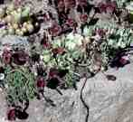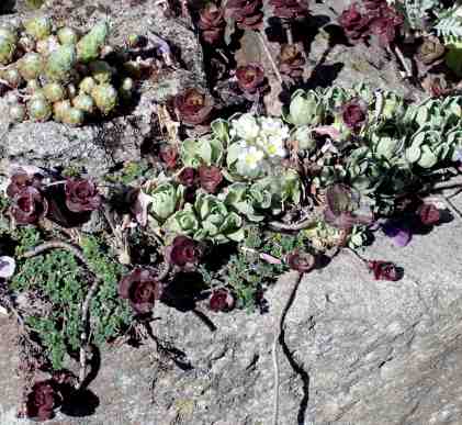Zu Beginn waren auf jedem Stein mehr Arten als jetzt geblieben sind. Auf diesem Stein wurde die violette Form von Sedum spatulifolium von den Sempervivum-arten und dem Steinbrech (Saxifraga aizoides) verdrängt, ebenso der kleine Thymian (vorn)