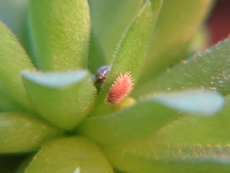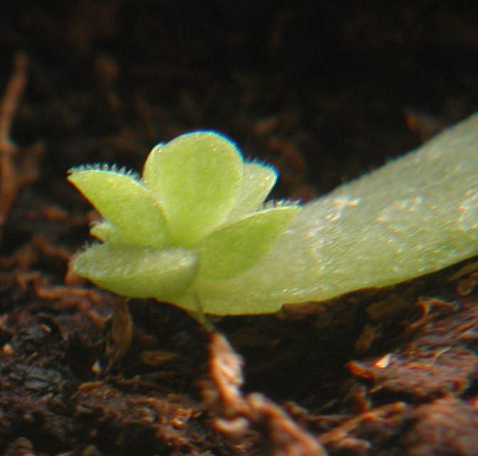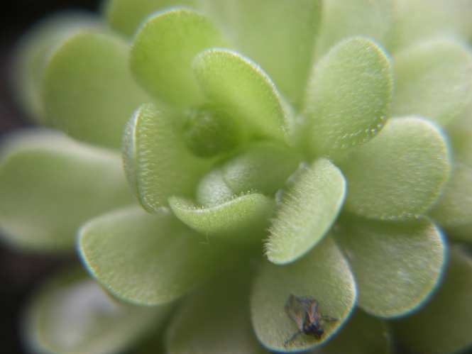 Etwas enttäuscht war ich bei dem Versuch, die Pflänzchen mit winzigen Fliegen zu füttern. Die länglichen Winterblätter, die hier abgebildet sind, verdauen wohl nicht. Der Versuch, sie mit winzigen Fliegen zu füttern, hat nicht geklappt, die sind nur vertrocknet und lagen nach Wochen immer noch unverändert da. Das Foto unten hatte ich auch gar nicht wegen der vertrockneten Fliege gemacht sondern wegen der Blütenknospe, die aber leider auch vertrocknet ist und nicht aufgeblüht. Auf dem Foto sieht man den Übergang von Winterblättern zu Sommerblättern.