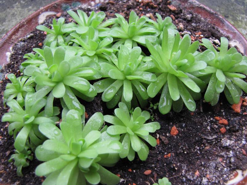 Jetzt, am 15. Juli, sind die Rosetten noch etwas größer geworden. Ich habe heute das Foto oben gemacht, weil die Pflanzen noch einmal neue Knospen angesetzt haben. Seit Februar blühen sie jetzt ununterbrochen. Der neue Blütenansatz (wohl das vierte Mal dieses Jahr) wurde erreicht durch Abwechseln von sehr nassen Phasen und völligem Austrocknen. Ich werde die Pflanzen die nächsten Tage regelmäßig gießen und sprühen, etwa zwei Wochen lang und dann zwei Wochen abwarten. Wenn in vier Wochen die jetzigen Knospen noch blühen, werde ich die Erde wieder ganz nass machen und wieder sprühen. Ich werde dann berichten, ob es klappt, dass dann noch einmal Knospen gebildet werden.