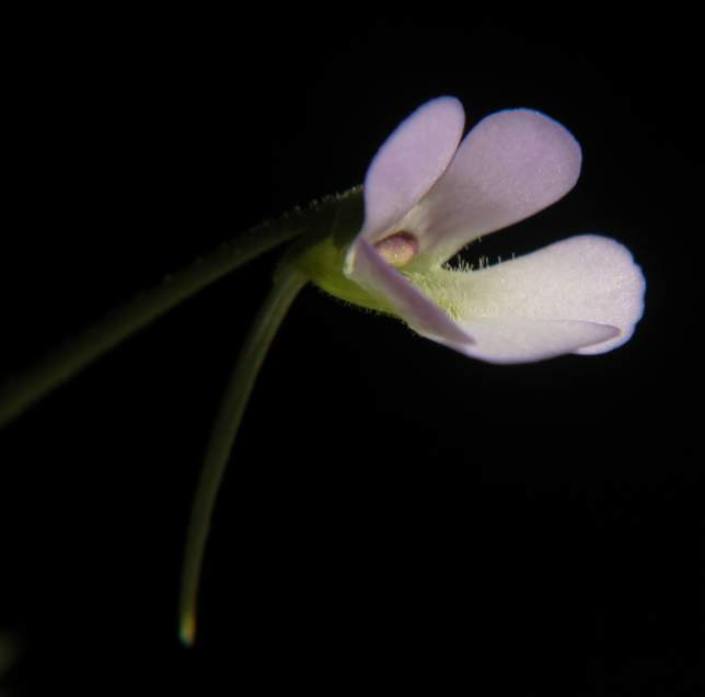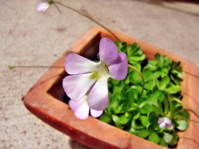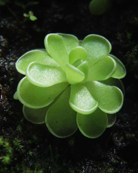 Dazu möchte ich kurz die Geschichte erzählen. Dieses Pflänzchen ist eine fleischfressende Pflanze aus Mexico, ein Fettkraut (Pinguicula esseriana). Ich habe die Pflanze als Ableger noch aus der Zeit, als ich im Schulbiologiezentrum (1989 bis 2001) u.a. auch zur Ausleihe kleine Terrarien mit fleischfresenden Pflanzen eingerichtet hatte. Für mich zu Hause hatte ich mir ein winziges Gärtchen mit mehreren Arten in einem großen Glas eingerichtet. In dem Glas versäuerte die Erde schließlich so, dass die anderen Arten (auch wegen Trockenheit zwischendurch) eingingen und die Mutterpflanze immer kleiner wurde und schließlich nur noch ein winziges Rosettchen bildete, so groß wie eine halbe Erbse.