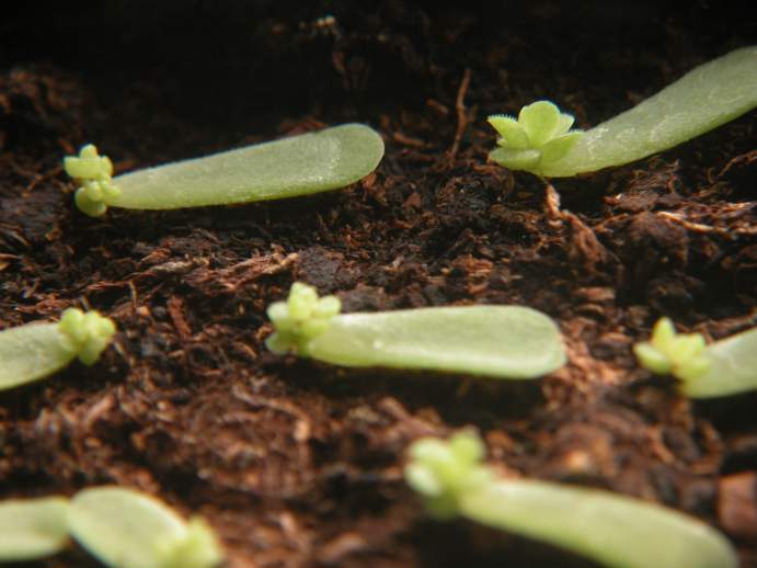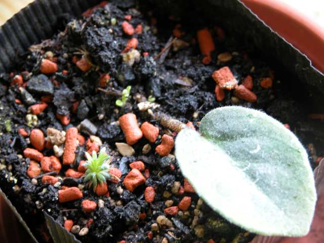 An der Blattwurzel bildet sich dann ein neues Pflänzchen. Erstaunlich ist dabei, dass sich erst sehr spät Wurzeln bilden. Auf diesem Foto hat nur das größte Pflänzchen eine kleine zarte Wurzel, die man auf dem unteren Bild besser erkennen kann.