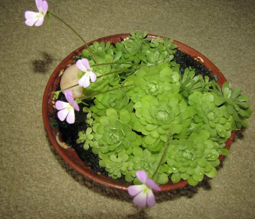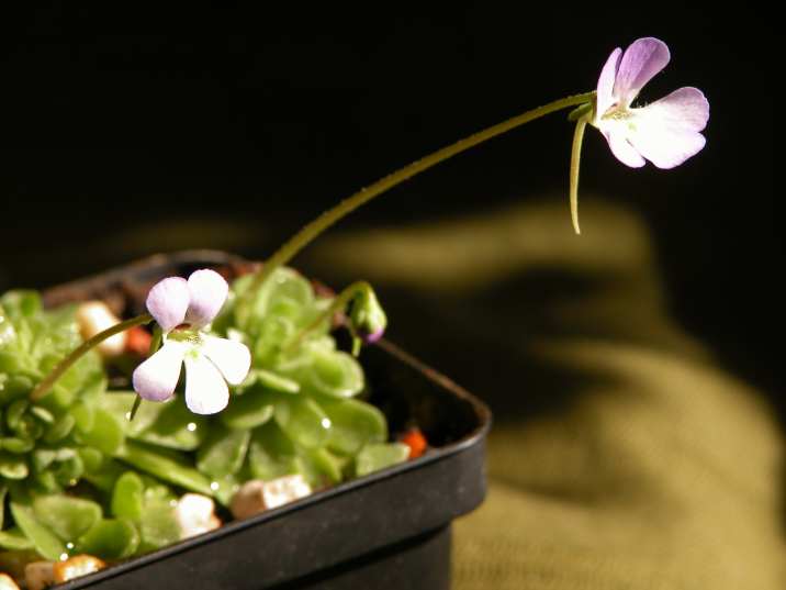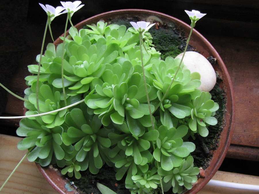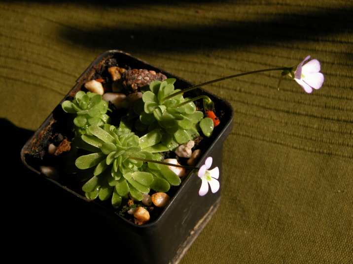 2012 habe ich die Pflanzen umgepflanzt in eine große Tonschale mit ganz normaler Blumenerde aus dem Supermarkt. Sie haben lange gebraucht, sich umzugewöhnen. Aber jetzt (Juni 2013) sind sie gesünder als je zuvor. Sie blühen seit Februar ununterbrochen. Ich gieße unregelmäßig, lasse sie weitgehend trocken werden und gieße dann wieder ganz großzügig, so dass die Erde richtig nass wird. Dabei sind jetzt die Rosetten groß geworden, 6cm im Durchmesser. Und das Fangen von Trauermücken klappt gut.