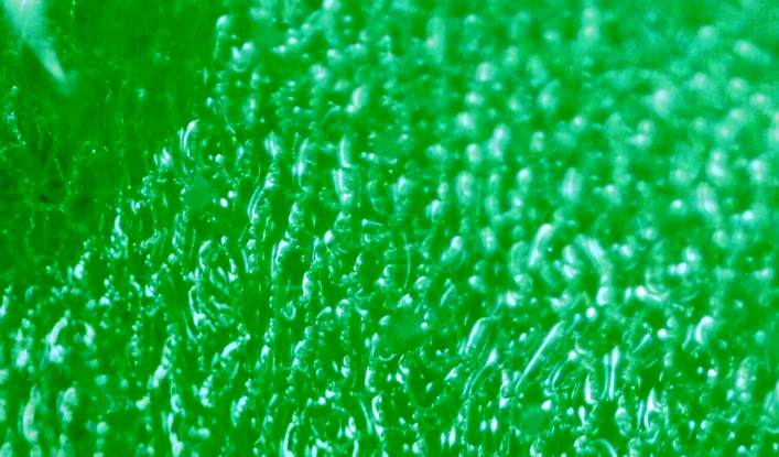 Unten die Drüsenhaare etwa 230 fach vergrößert. Man erkennt die Sekret-Tröpfchen an der Spitze.