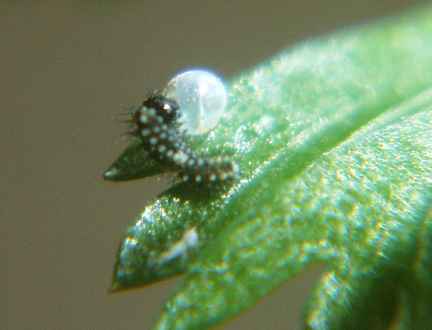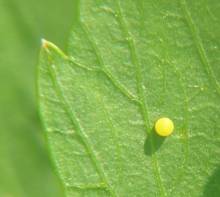 Falter flog dann weiter. Ich ging an die Stelle und fand auch wirklich das Ei, pflückte das Blättchen mit dem daran klebenden Ei ab und nahm es mit in die Wohnung, wo es vor Fressfeinden besser geschützt war und beobachtete dort in der nächsten Zeit die Entwicklung, von der diese Fotos entstanden. | |||