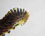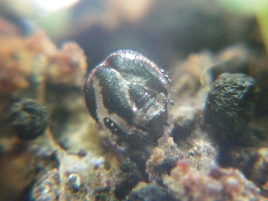 ![]() Nur der Kopfpanzer wird nicht gefressen. Auf der Vergrößerung erkennt man die Punktaugen und neben dem Kopfpanzer Kotballen. | |