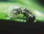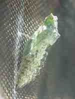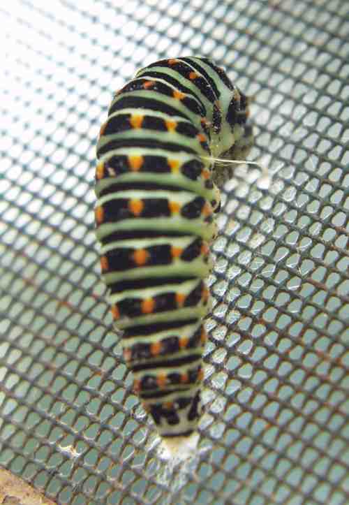 ![]() Vor der Verpuppung spinnt die Raupe Fäden, mit denen sie sich an der Unterlage befestigt.