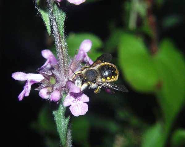 Zum Verdruss der anderen Nutzer meines Gartens darf bei mir der Ziest an bestimmter Stelle im Garten wachsen. Ich kann dabei die Abneigung gegen diese Pflanze durchaus nachvollziehen, hat sie nämlich dicke, brüchige Speicherwurzeln, die nie restlos herauskommen beim Jäten und aus deren Resten sich immer wieder eine neue Pflanze bildet. Ganz schlimm wird es, wenn man eine Fräse benutzt, dann werden die Wurzelstückchen gleichmäßig im ganzen Garten verstreut und dann wächst der Ziest bald auf allen Beeten. Darüber freut sich aber eine, nämlich die Wollbiene Anthidium manicatum. Wollbiene heißt das Tierchen, weil sie die wolligen Haare vom Ziest sammelt für ihren Nestbau. Sie braucht den Ziest auch als Futterpflanze, und deshalb darf der Ziest bei mir im Garten wachsen - nur eben nicht überall. Auch, wenn nicht gefräst wird, wird der Ziest im ganzen Garten verteilt, wenn da auch Wühlmäuse wohnen. Diesen Tierchen schmecken die Ziestwurzeln offenbar auch besonders gut und sie legen überall Speicher an, in denen sie diese Wurzeln für den Winter bunkern.